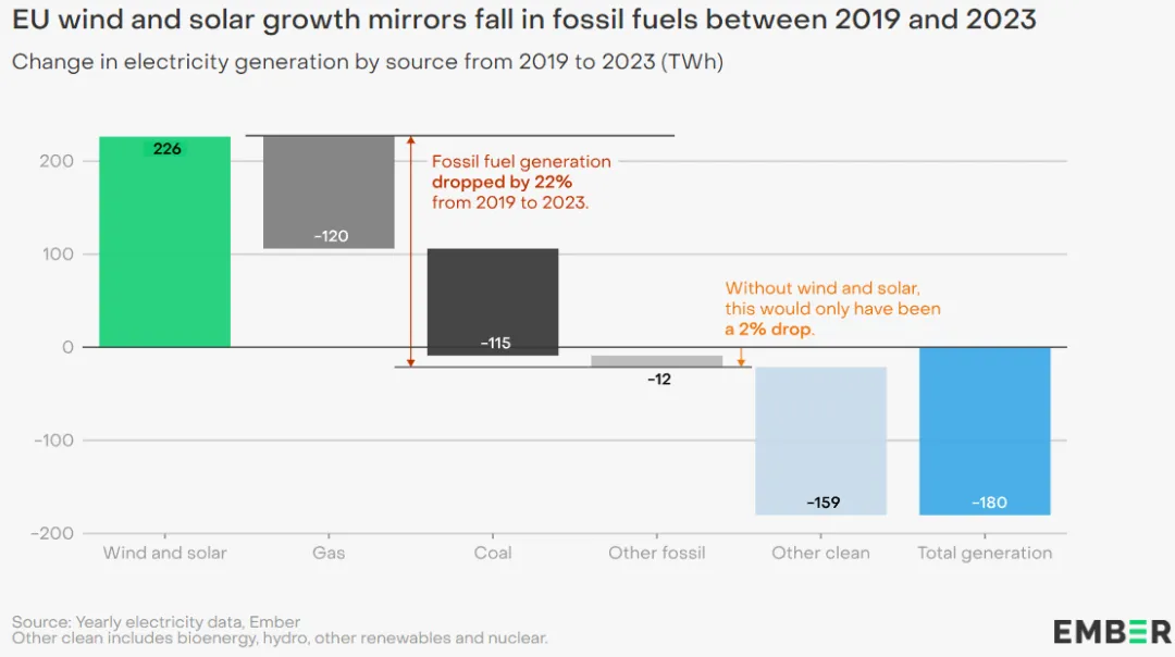 风能和太阳能发电量的增加(+226 TWh,+46%),足以取代 2019 年至 2023 年期间欧盟五分之一的化石能源发电量。