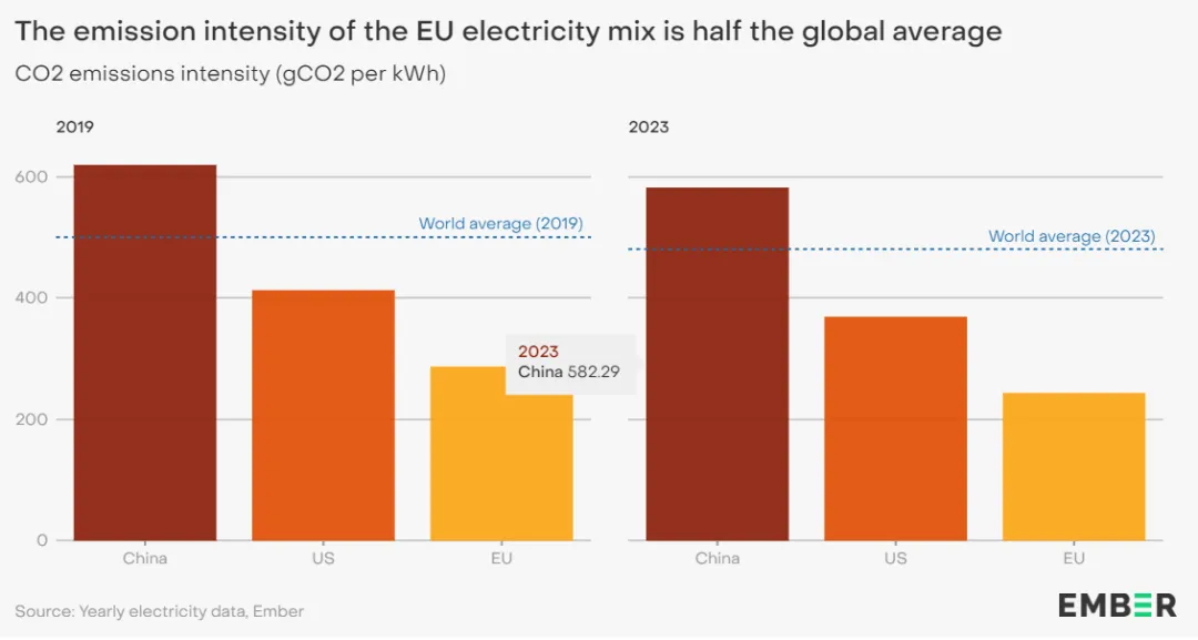 2019 年,欧盟发电的排放强度为每千瓦时 287 克二氧化碳,不到全球平均水平的一半,而全球平均水平为每千瓦时 501 克二氧化碳。