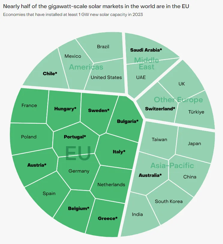 在 2023 年全球安装 1 吉瓦或以上太阳能容量的 28 个国家中,欧盟成员国占 13 个,几乎占一半。在这 13 个欧盟国家中,只有 5 个在 2019 年是吉瓦级市场。