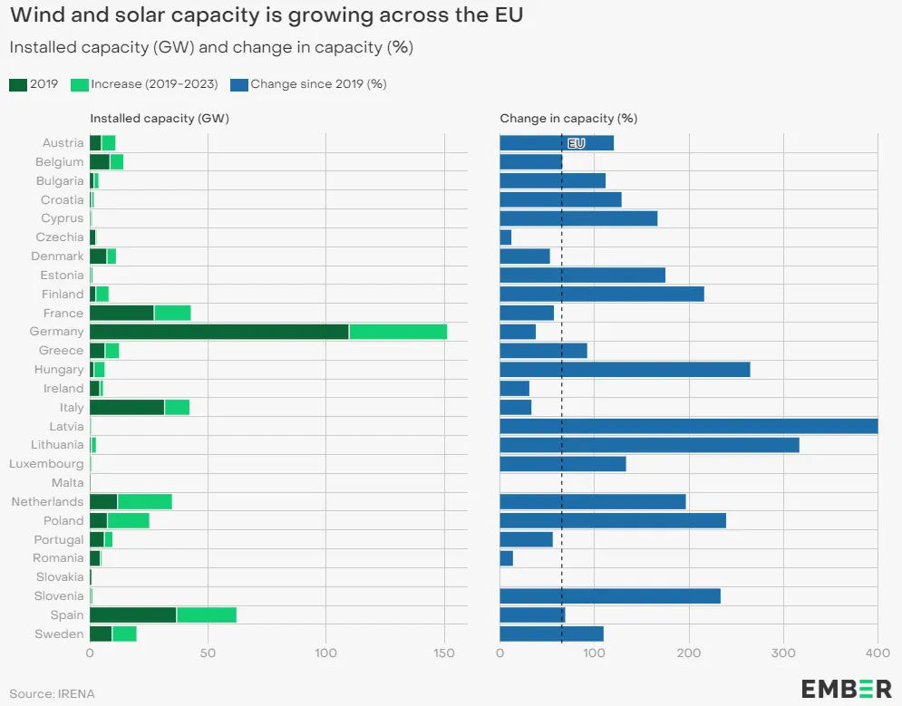 在 2019 年至 2023 年期间,27 个成员国中超过半数国家的风能和太阳能装机容量至少增加了一倍,许多国家甚至增加了两倍以上。