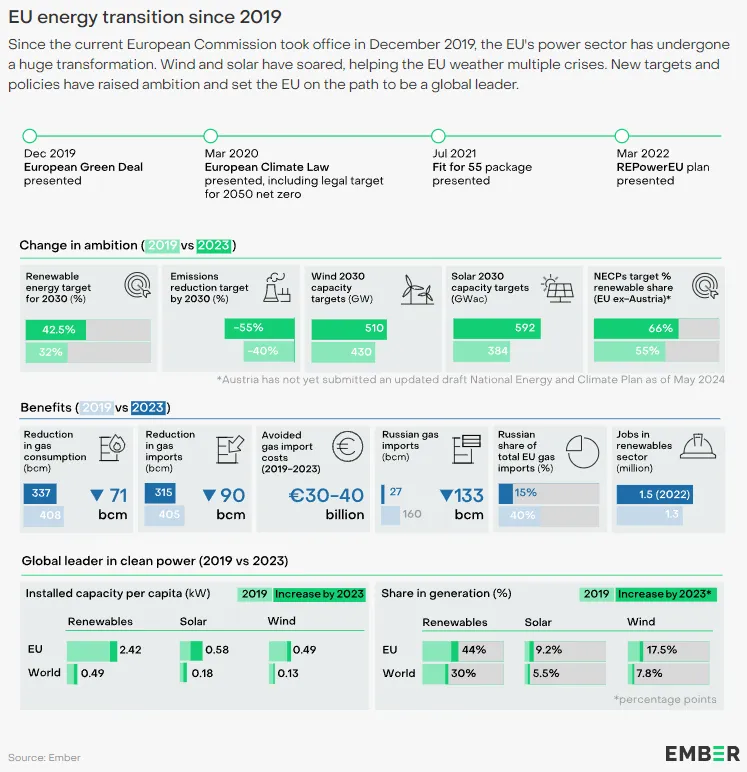 EMBER报告指出,自 2019 年欧盟委员会上任以来,欧盟的电力行业发生了巨大变化。风能和太阳能发展迅速,取代了化石燃料发电并降低了排放量。这延续了欧盟在能源转型方面的全球领导地位,许多成员国都采取了雄心勃勃的能源和气候方针。