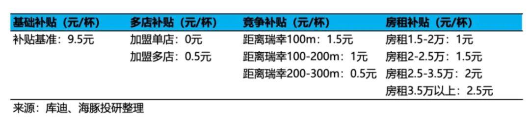 按照海豚投研整理的库迪补贴政策,库迪首先有单杯的基础补贴,即补贴基准9.5元,只要联营商单杯售价卖不到9.5元,库迪统一按照9.5元计算。此外,还有多店补贴,竞争补贴以及房租补贴,如加盟多店单杯再补贴0.5元,距离瑞幸门店越近补贴越多,房租越高补贴越多等。