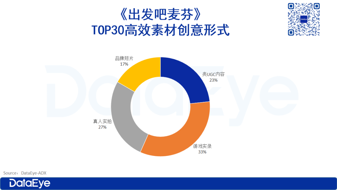 DataEye-ADX数据显示,《出发吧麦芬》最多计划使用的TOP30视频素材内容中,游戏实录占比最高,达33%;其次是真人实拍,占比达27%;类UGC内容和品牌短片分别占比23%和17%。