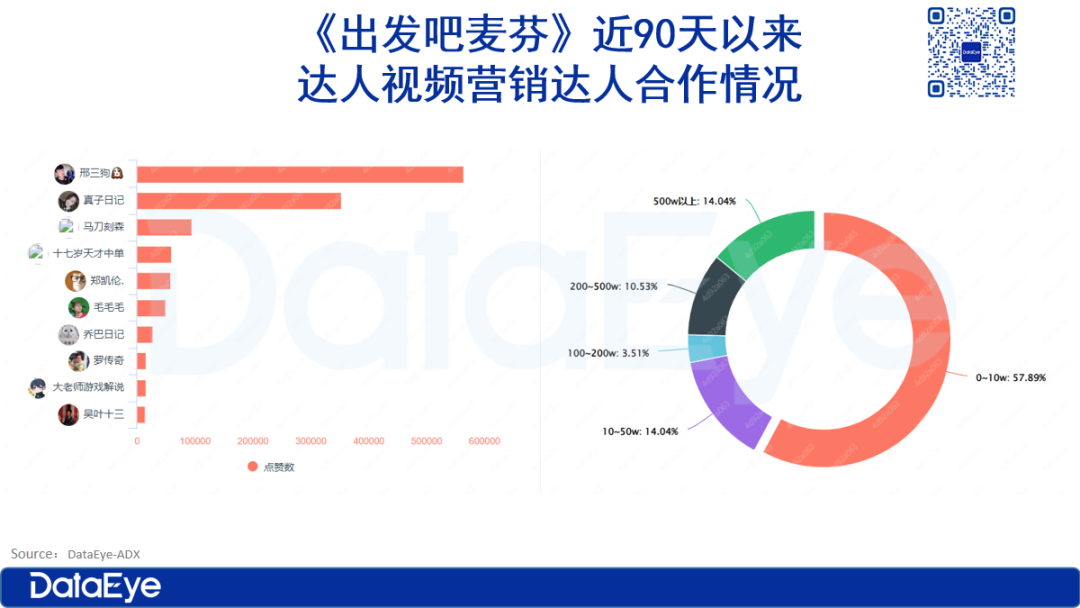 DataEye-ADX达人营销数据显示,《出发吧麦芬》在上线当天开启了抖音效果型达人营销,合作的达人头中腰尾部均有涉猎,百万粉丝以上头部主播占比三分之一,0-10w粉丝的尾部粉丝占比超过半数。内容不限于垂直领域,包含了颜值变装、剧情、萌宠、科普、游戏等等多个领域。其中,项目组侧重“搞笑剧情”类达人,与头部博主“张百乔”合作,其参与近期较火的《快乐向前冲》,在记录过程中植入游戏,目前抖音#出发吧麦芬话题已经超过3亿次播放。
