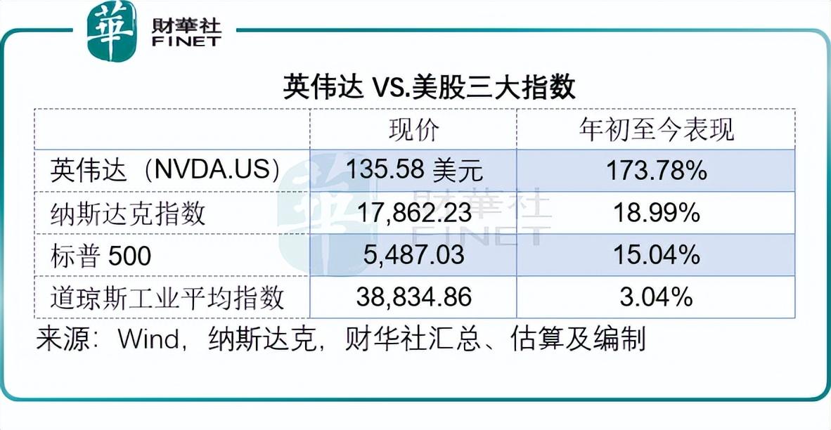 英伟达还没来得及进入道琼斯工业指数,就已经成为了全球市值最高的上市公司,这也是包含了英伟达的纳斯达克指数和标普500指数持续跑赢的原因。今年以来,道琼斯工业指数仅累涨3.04%,而纳斯达克指数和标普500指数则分别累计上涨18.99%和15.04%。