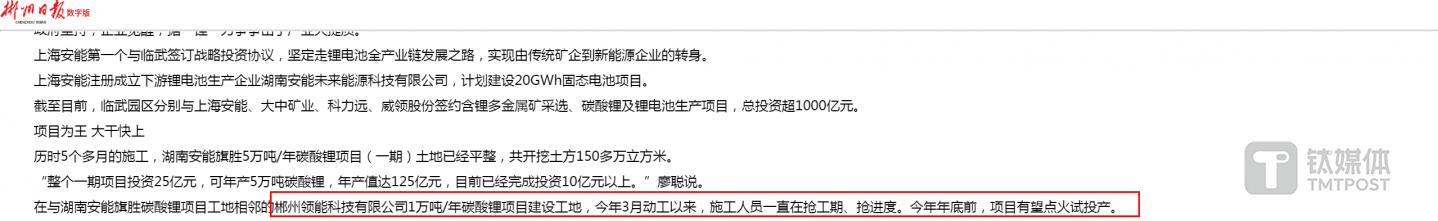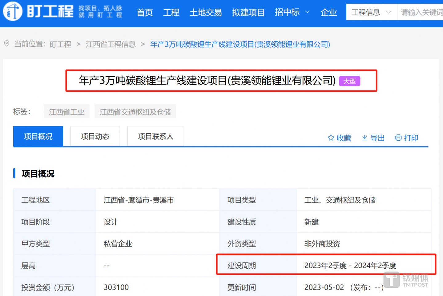 钛媒体APP发现,公司年产3万吨碳酸锂项目进展似乎缓慢。盯工程网显示,该项目总投资金额3.03亿元,建设周期为2023年2季度-2024年2季度。截至2023年末,该项目工程进度仅为3.35%。由此来看,公司能否在半年时间内能完成剩余96.65%工程?是否存在无法按期完成风险?