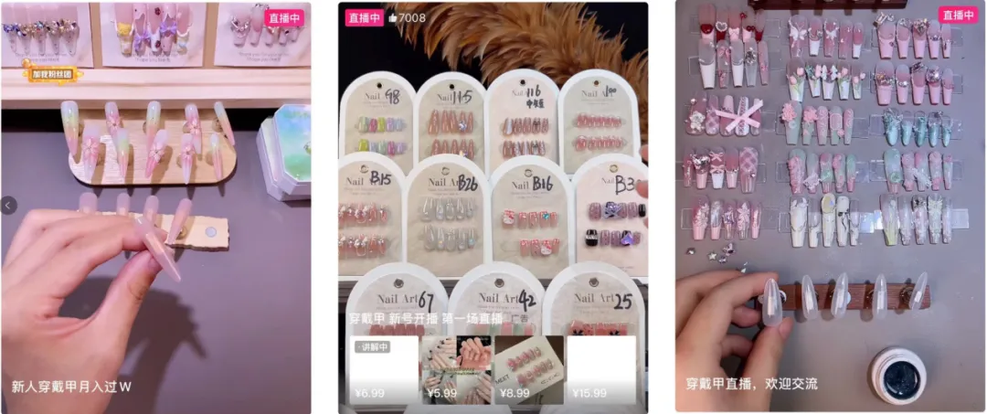 其实翻看当下最主流的消费业态,即直播带货不难发现,穿戴甲确实是一个能触达万千爱美女性的优选商品。眼下,少有某个类别的商品直播间能做到这么细分的:既有甲油胶、美甲灯、贴纸、合金等各种美甲用具的效果展示及销售,又有缺码孤品、通货高货等穿戴甲成品纷纷上架小黄车,还有个人美甲工作室通过直播秀技术获客接到定制大单……