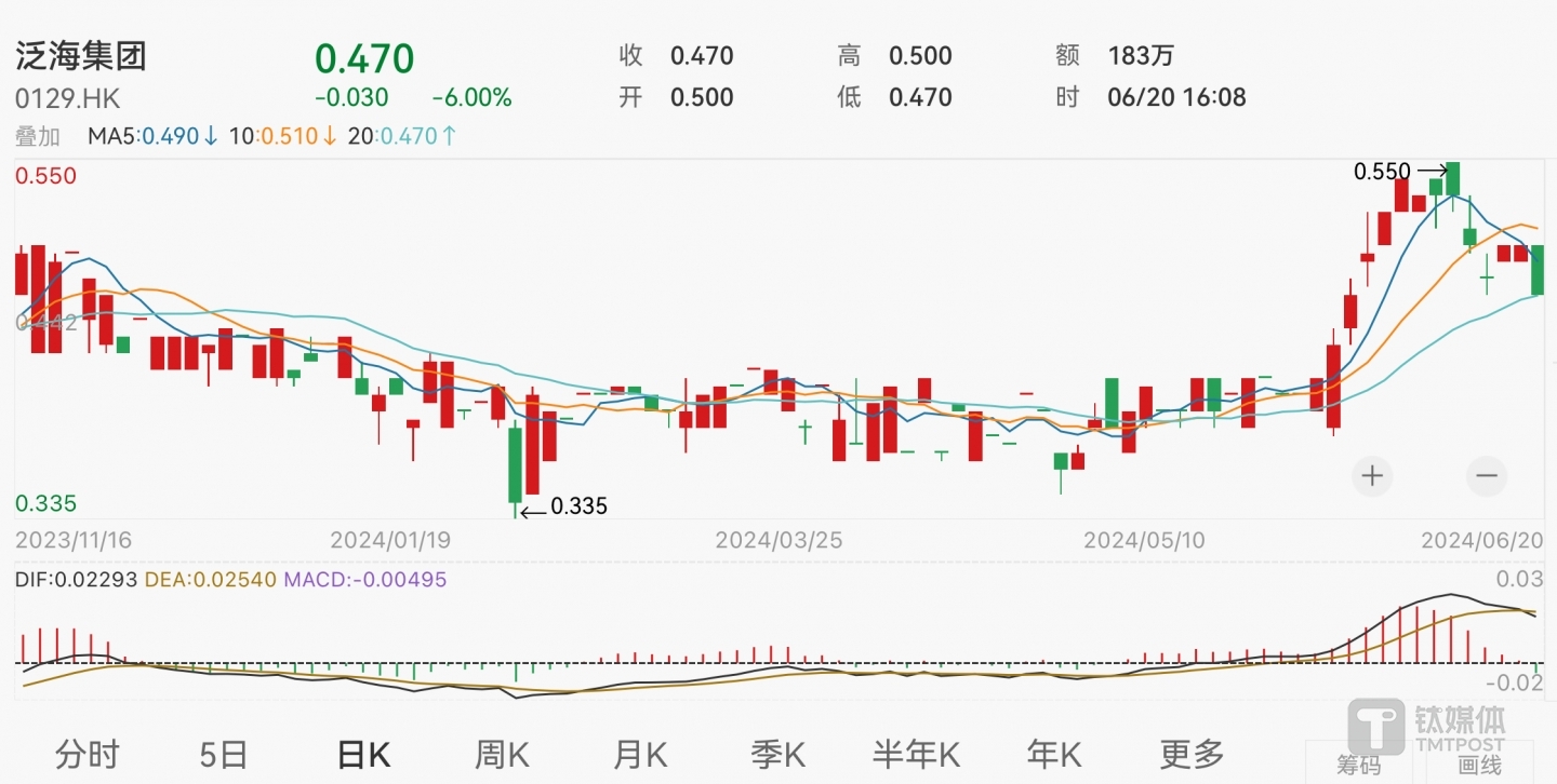 泛海集团在二级市场上的表现则相对低调,截至今日收盘,该公司股价报收0.47港元,跌6%,公司总市值约6.2亿港元。