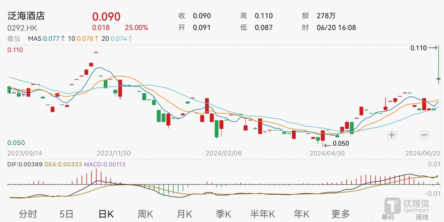 在上述消息的背景下,泛海酒店今日股价大涨,开盘时一度飙升至52.78%,刷新了近11个月来的股价新高,为0.11港元,而后开始回落。截至6月20日港股收盘,泛海酒店收涨25%,报0.09港元。