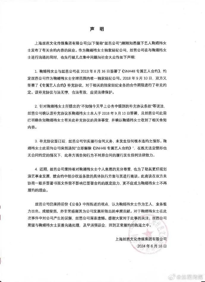 但丝芭传媒却发声明宣称双方签订了补充合约,尽管鞠婧祎明确表示自己对“补充协议条款”“第二阶段合作”完全不知情,并在早前就向丝芭传达了不续约的决定。丝芭却一再坚称双方于2018年9月签署了《专属艺人合约》补充协议,针对独家经纪业务的合作期限进行了补充约定。
