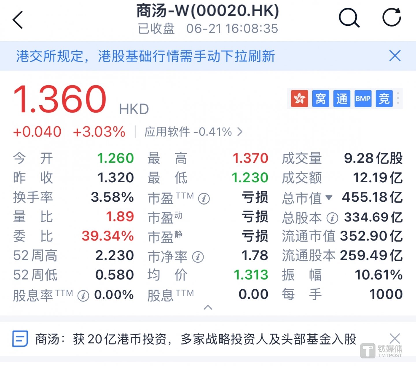 受此消息影响,商汤科技(0020.HK)股价逆势上涨,盘中最高涨幅达3.79%。截至6月21日下午16点收盘,商汤报收1.36港元/股,较昨日收盘价上涨3.03%,市值455.18亿港元。