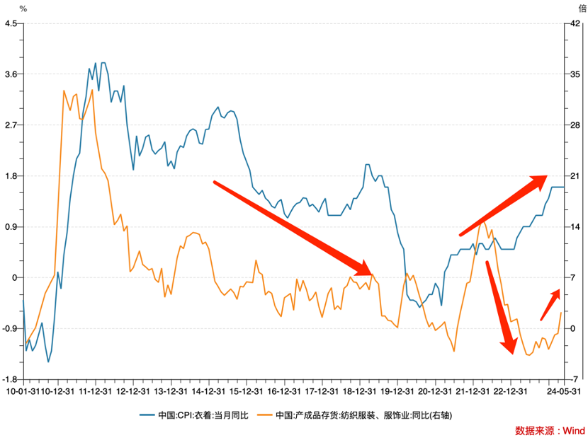 篇幅原因,我们仅举服装行业为例,根据以往经验,行业景气度(体现在CPI上)与库存周期高度契合。