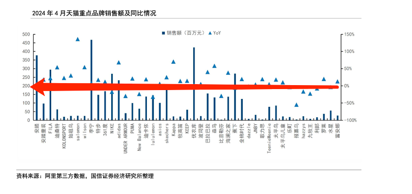 上图为国信证券统计的重点服饰品牌在天猫的销售和同比增长情况,2024年4月绝大多数品牌在天猫增长均有明显的回弹,其同比增长中枢在50%上下。在经历残酷的降价去库存周期之后,头部企业率先拿到了成长筹码。