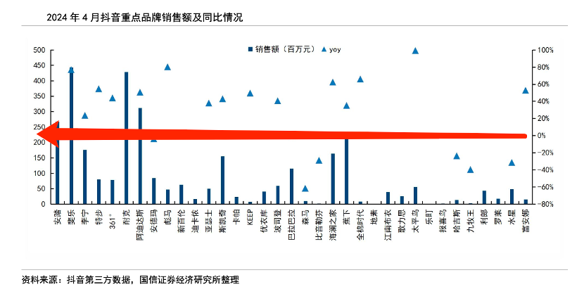 看到上述报告我们还是非常吃惊的,一方面不同品牌在抖音的带货效果千差万别,上图中点状分布比较分散,另一方面部分在天猫上取得不错成绩的品牌在抖音可谓是泯然众人矣,如森马在天猫同比增长超过50%,在抖音则缩水超过50%。
