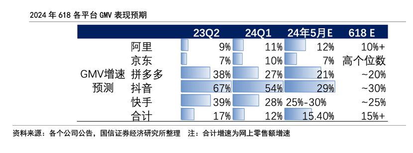 如在易观最新的报告中,618综合电商平台GMV同比增长11.2%,其中淘宝天猫增速超过了大盘,达到12%,国信证券研报认为全网618期间同比增长在15%以上,受取消预售等因素影响,交银国际认为5月线上实物电商增长在13%以上,华泰证券则测算618 大促期间 GMV 口径下电商平台合计增速或接近中双位数水平 (15%左右)。
