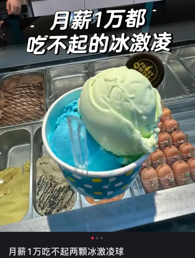 冰淇淋界「爱马仕」依然存在,社交平台上,一张彩色双球冰淇淋照片,配上一句“月薪1万都吃不起的冰淇淋”,成为新的流量密码,在众多商场中,也仍有大批中产阶级消费者愿意为一个59元的冰淇淋球排队买单。