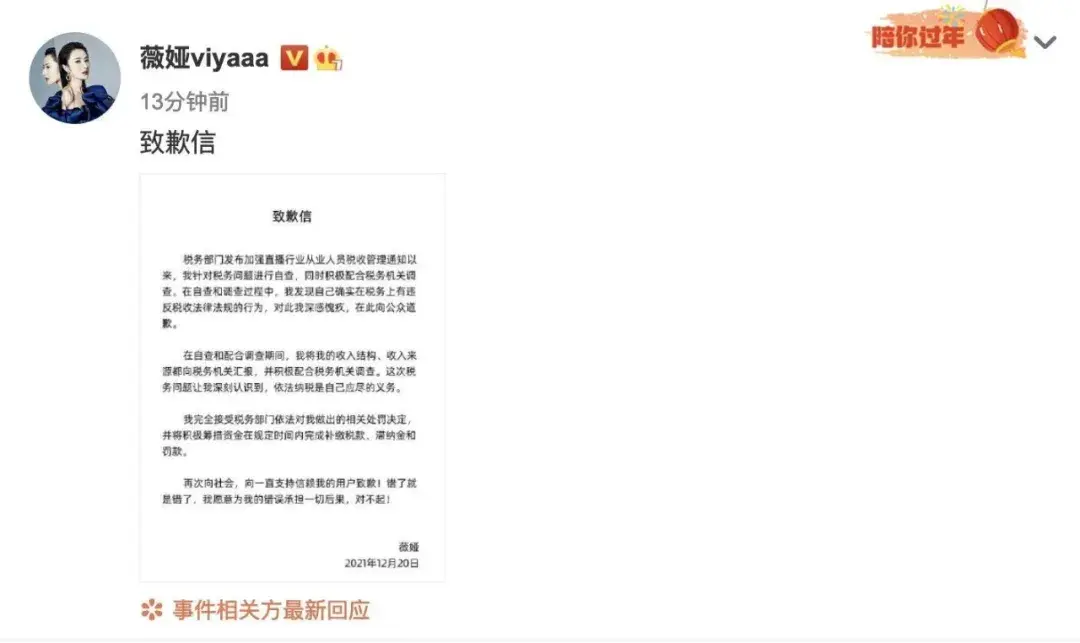 随后,薇娅发布声明向公众致歉,并表示“愿意为我的错误承担一切后果”。