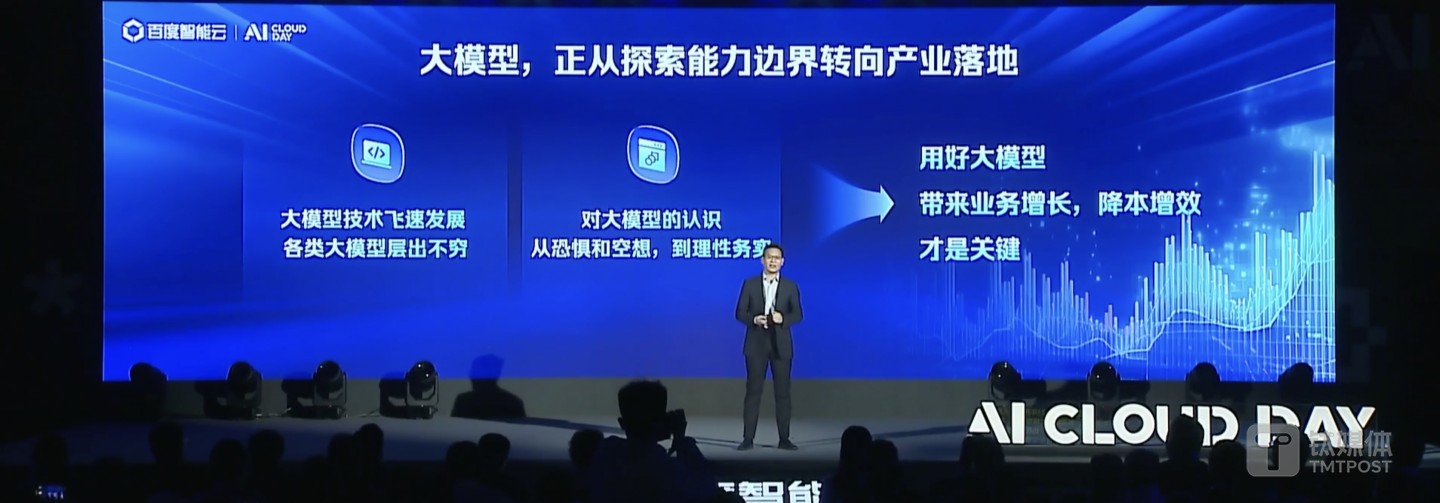 今年3月百度智能云系列产品发布会上,喻友平谈到,随着大模型不断发展,大家对 AI 的想法越来越理性、越来越务实,怎么把大模型用到企业中间去,真正去带来企业的业务增长、提高效能,这个才是关键。