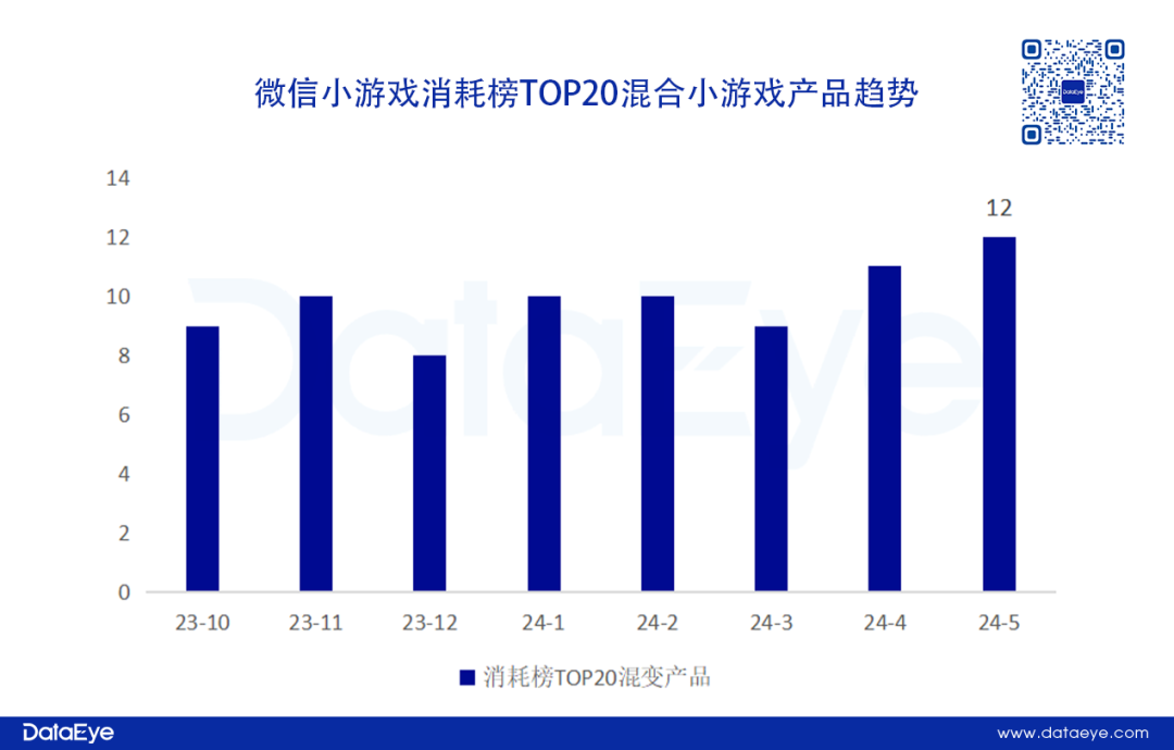 一,月度消耗榜TOP20,混变小游戏占比持续提升。微信小游戏买量月报数据显示,进入2024年后,混变小游戏在月度消耗榜TOP20中的比例逐渐提升。去年12月月消耗TOP20中,混变小游戏占比约为40%,而在最新的5月份数据来看,混变小游戏产品高达60%。事实上,今年以来每月的消耗增长榜中,混变产品的占比都非常高,其中3月份的消耗增长榜中,混变小游戏占比高达75%。意味着越来越多混变产品进入市场,并且不乏头部游戏厂商。