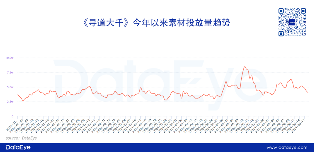 二,混变小游戏投放素材量强劲,厂商投入增加。DataEye-ADX数据显示,近90天投放素材榜TOP50中,混变小游戏占比约64%。目前来看,投放力度最大的产品均为混变小游戏。其中,三七旗下《寻道大千》在今年依然保持着日均4.2万条素材,单日投放素材量可以突破8万条。