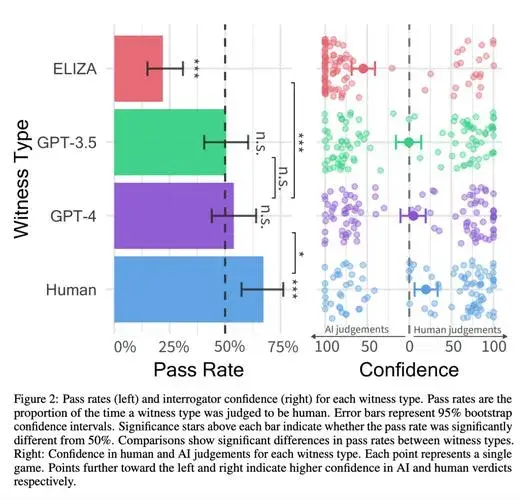 结果显示,真人被正确辨认的比例则为67%;ELIZA只有22%;GPT-4和GPT-3.5则高达54%、50%。