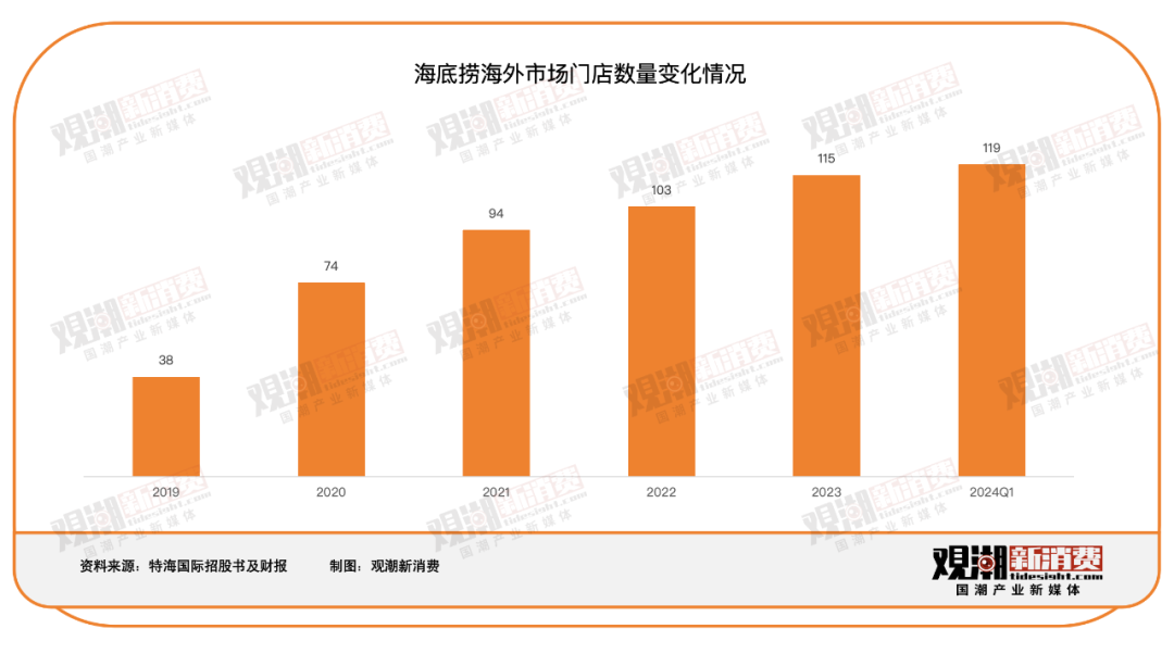在主营业务海底捞、负责底料供应的颐海国际之后,特海国际成为海底捞第3家分拆上市的子公司。在香港顺利上市后,特海国际的出海步伐继续提速,截至2023年底,特海国际的门店总数达到115家,营收同比增长22.94%至6.68亿美元(约合48.27亿元人民币)。