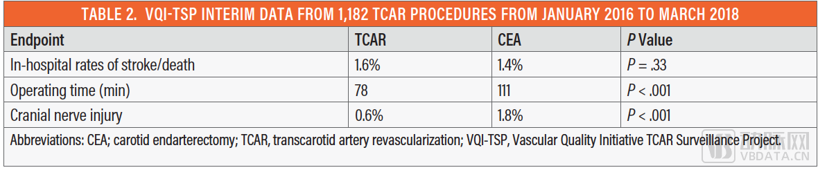 一项关于TCAR与颈动脉狭窄金标准术式CEA的对比研究显示:尽管接受TCAR的患者有更高的医疗风险,但TCAR和CEA的住院卒中/死亡率相似。该研究选取了美国血管外科协会的VQI数据库中2016年1月至2018年3月期间的1182例TCAR和10797例CEA进行分析。