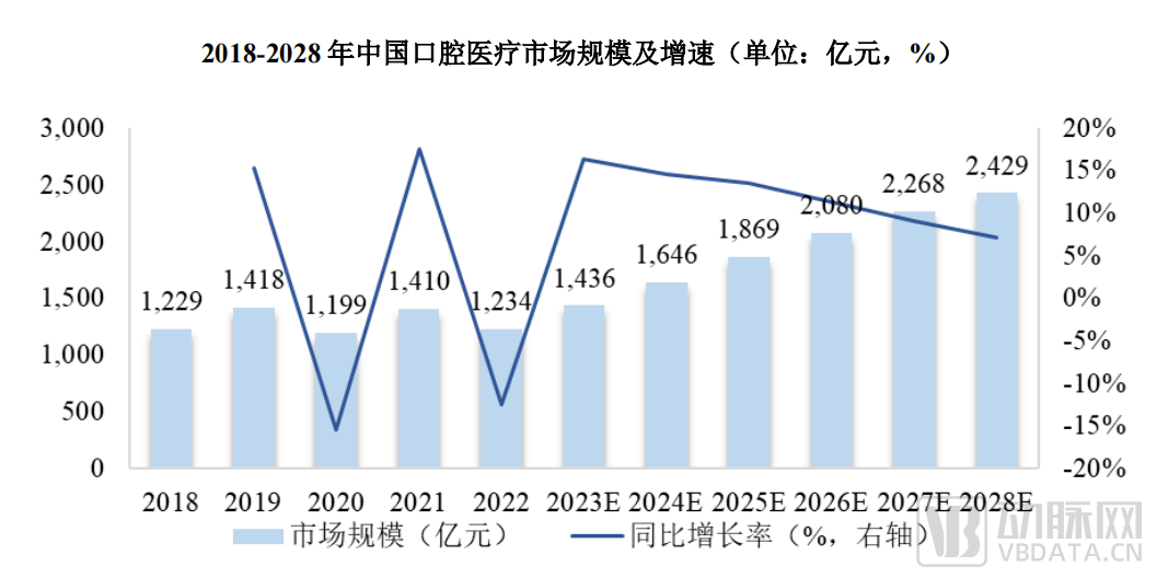 据沙利文、中泰证券研究所的数据,2018年到2028年,我国口腔医疗行业市场规模将从 1229 亿元增长至 2429 亿元,复合增速为 7.1%。行业规模的增长一方面得益于就诊人数的增加,另一方面得益于口腔医疗人均消费支出的上涨,呈现量价齐升局面。预计未来中国口腔医疗市场规模仍具有较高的增长空间。