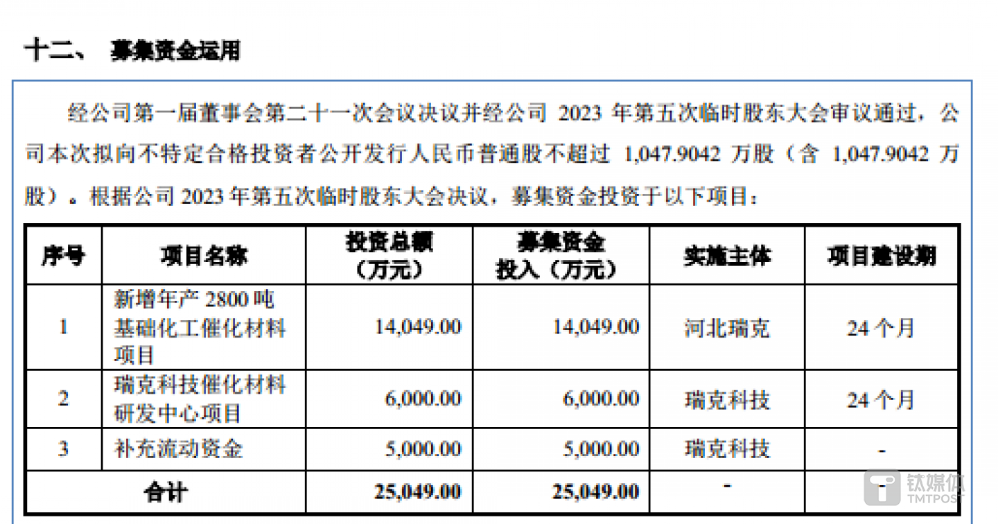 瑞克科技此次欲募集25049万元分别用于新增年产2800吨基础化工催化材料项目、瑞克科技催化材料研发中心项目、补充流动资金。