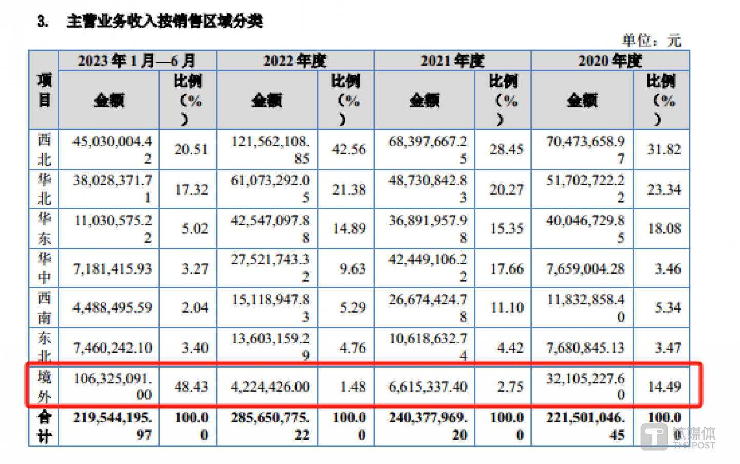 从区域上看,上述时间段内,瑞克科技的业绩几乎全部来自境内,具体情况如下:
