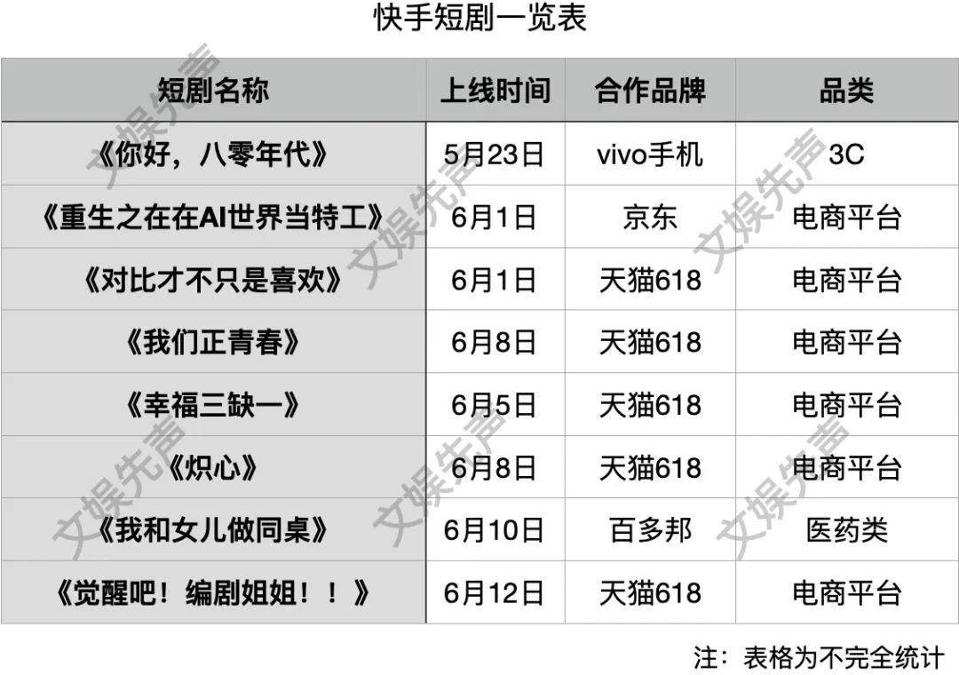 与此同时,电商平台与内容平台彼此同样奉行着互利双赢的战略。比如618期间,快手为京东上线了品牌定制短剧《重生之我在AI世界当特工》,目前播放量达到了3.9亿。此外,快手还与天猫618联手推出了《炽心》、《觉醒吧!编剧姐姐!!》等短剧。