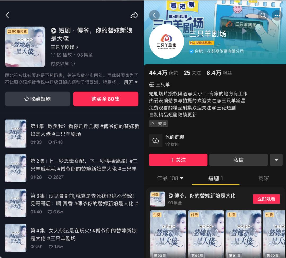 疯狂小杨哥专门上线了“三只羊剧场”系列合集,并发布首部付费短剧《傅爷,你的替嫁新娘是大佬》,但这部短剧的点赞量基本在几千、一万左右,基本等同于扑街。虽然小杨哥后续势必会将品牌定制短剧提上日程,但目前开局不利。