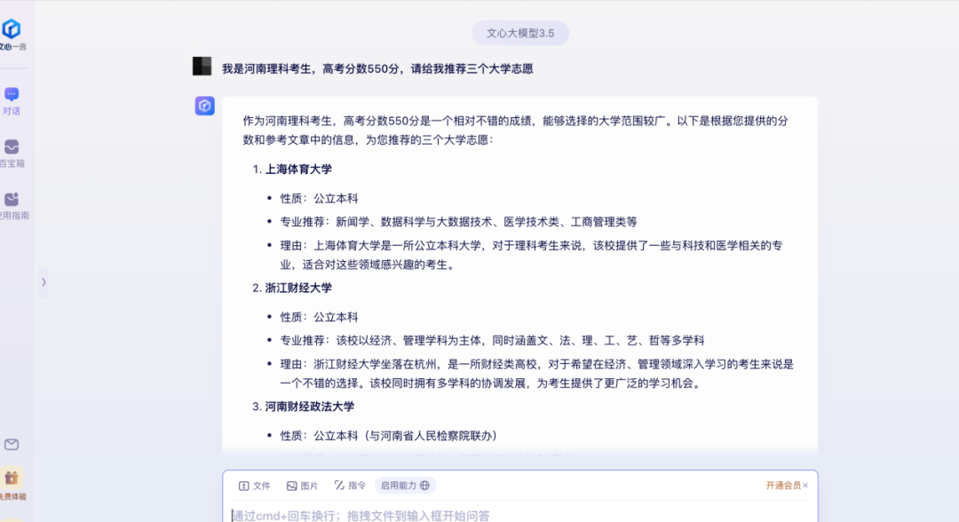 这些平台通常提供两种互动方式:首先是直接问答模式。用户可以将具体问题带到平台上,例如输入高考地区、考试分数、区域位次、兴趣方向等信息,向大模型提出询问。