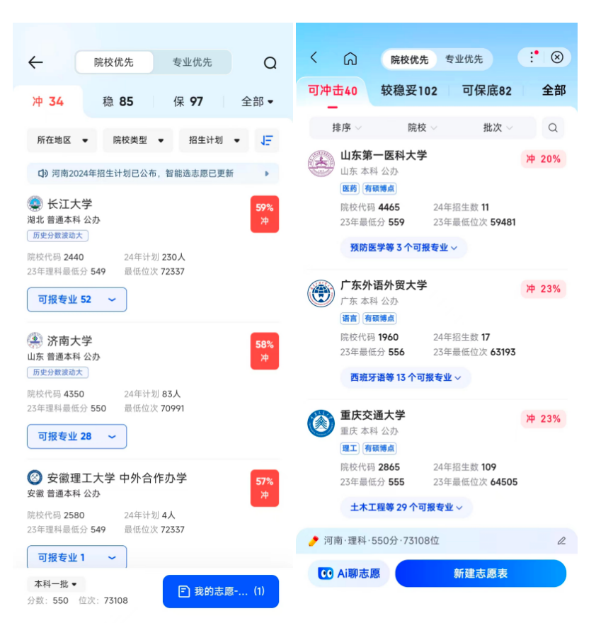 同样,也可以直接对比两个平台提供的“可冲击、较稳妥、可保底”志愿选项区别,这种比较可以揭示每个平台的算法精度和市场定位。