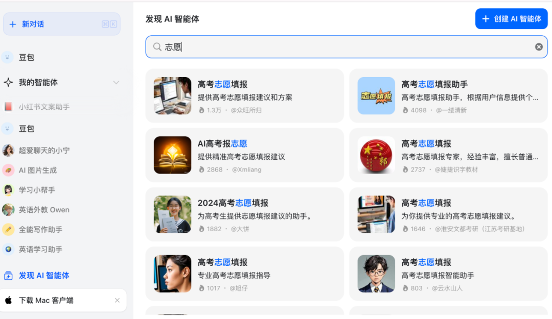 其次,为了帮助提问能力较弱的用户,这些平台还提供高考志愿助手工具,即智能体。