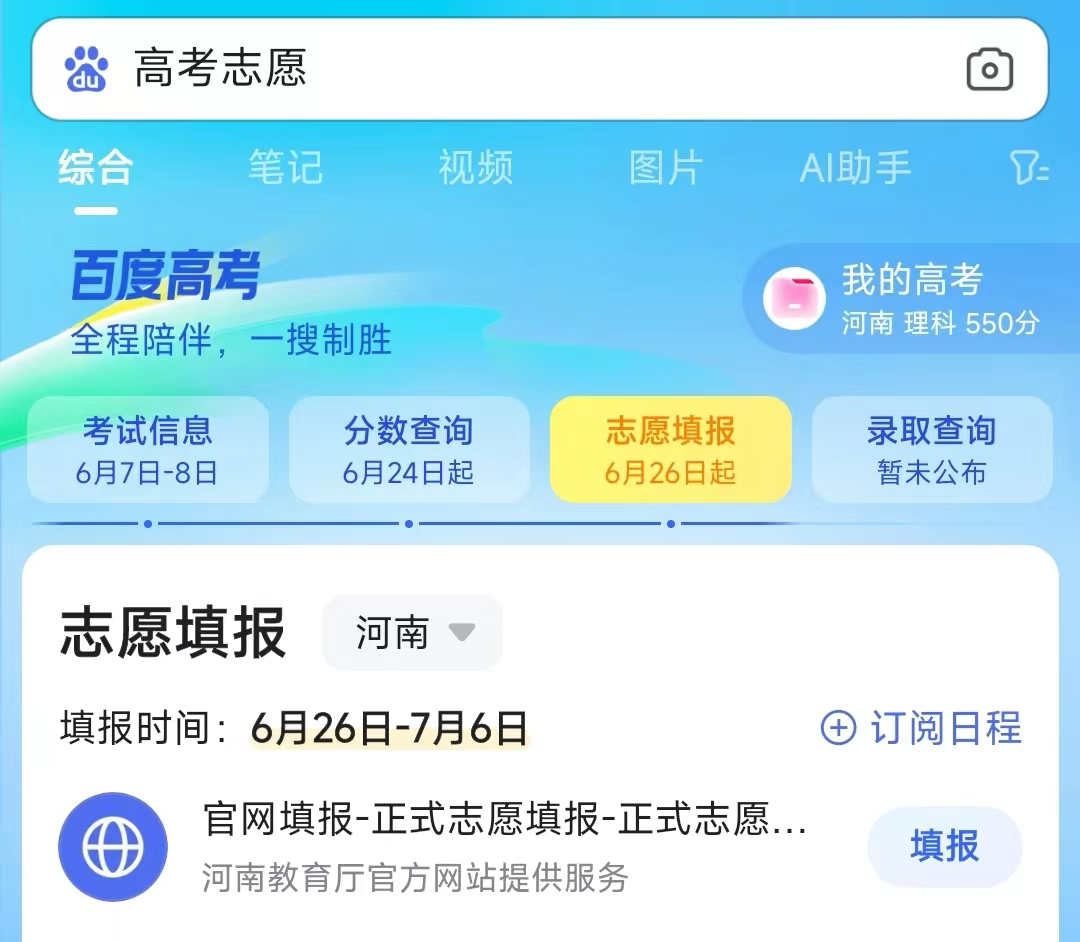 用户通过搜索“高考”即可直接进入专门的高考服务页面。在该页面中,通过大数据和算法模型的分析,百度的AI志愿助手也能提供基于院校或专业的志愿预测,分类同样涵盖可冲击、较稳妥、可保底等选项。