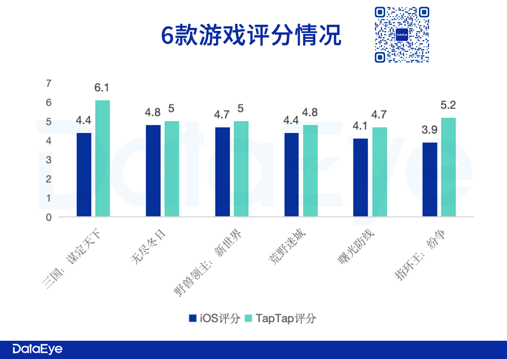 我们统计了截至6月27号它们的iOS评分(满分5)与TapTap评分(满分10)。具体如下: