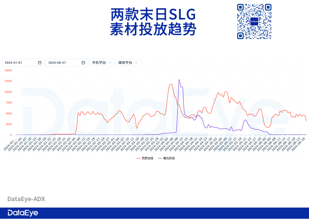三国题材商战,是这轮SLG混战最激烈的赛道,不止是买量投流,《三谋》贴吧早早被打上了其它三国SLG的品牌广告。同时,3月开始,头部SLG产品层面也动作频频,比如对三四年前推出的老武将进行了一波集体加强、庆祝达到一亿玩家、为玩家送五星橙将等等。近期,又出现大量达人拉踩《三战》《率土》的情况。末日题材,《荒野迷城》早在2月上线初期就开始中幅投放,在《曙光防线》上线前期出现投放高峰提前抢量狙击。《曙光防线》4月才姗姗来迟,从4月9号到23号短暂大手笔投放后,就快速下滑,目前基本停止投放,“高光”仅维持半个月。