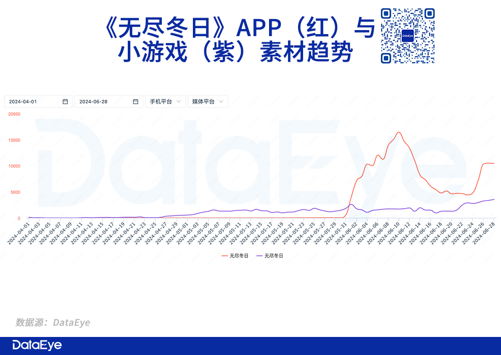 此外,《无尽冬日》是双端联投。类似的还有《霸业》《巨兽战场》。众所周知,小游戏端获量价格较低。用小游戏投放增加曝光,APP坐收自然量,不失为精明的策略。同时,小游戏端也可以通过某些隐蔽的方式,将部分大R转到APP。