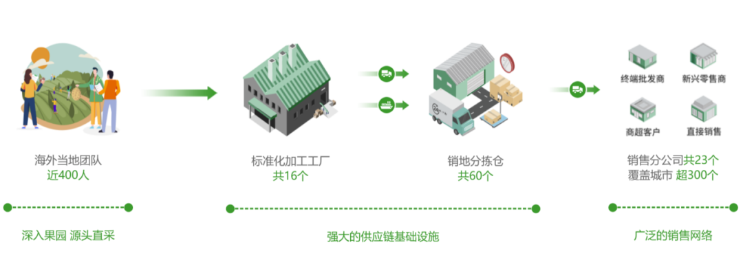 在这一模式的指导下,洪九果品直接与上游水果原产地对接,并通过标准化加工,叠加覆盖全国的销售网络以及数字化的供应链管控,最终将鲜果送达至全国零售终端。
