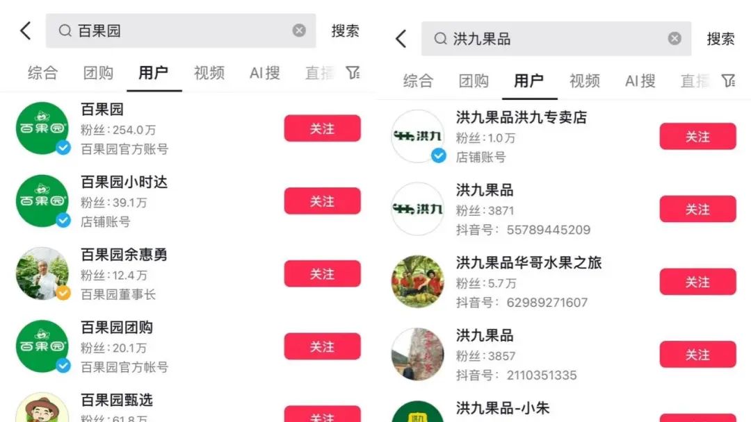 以洪九果品和百果园在抖音上的品牌声量为例,百果园拥有超250w的粉丝,而洪九果品系列账号的最高粉丝量只有前者的零头。