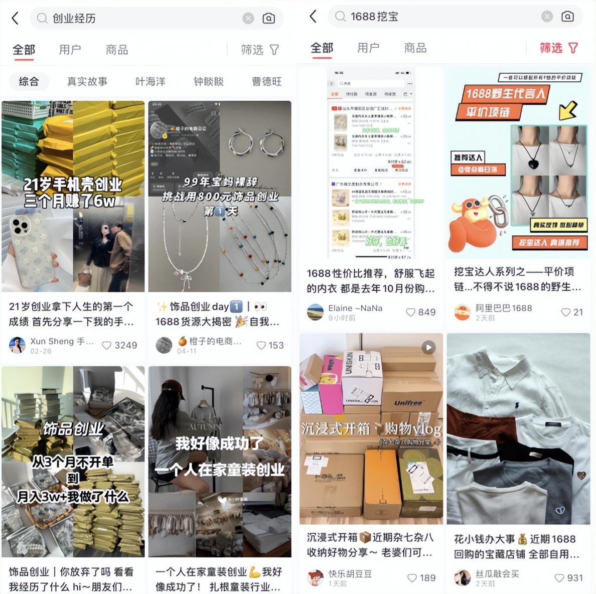 如今,在小红书平台上,已经有超过200万篇关于1688的自来水笔记,很多博主自发分享1688的挖宝或创业经历。更有甚者,分享前脚在1688挖宝平替,用了一段时间后挂到闲鱼上卖,然后继续去1688挖宝。