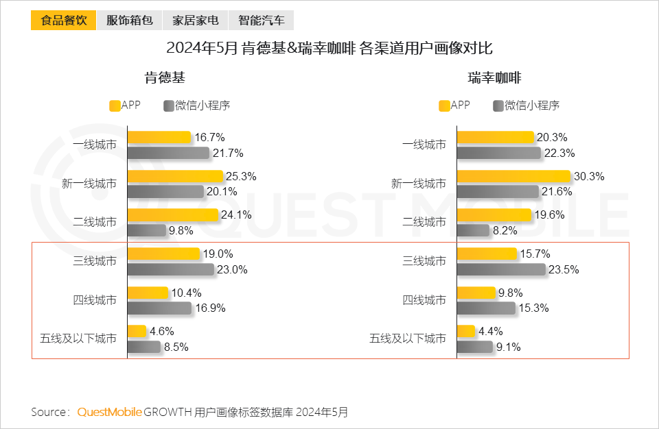 例如,在食品餐饮行业中,通过微信小程序提供基础的预约、点餐服务,APP提供深度会员服务,形成了差异化模式。截止到2024年5月,肯德基小程序月活用户为4943万,APP用户为2941万,二者重合用户仅为260万,具体构成上,APP近七成用户为一线、新一线、二线城市用户,小程序近五成用户为三线及以下城市用户;同样的,海底捞小程序用户432万,APP用户77.4万,二者重合用户仅为4.2万。