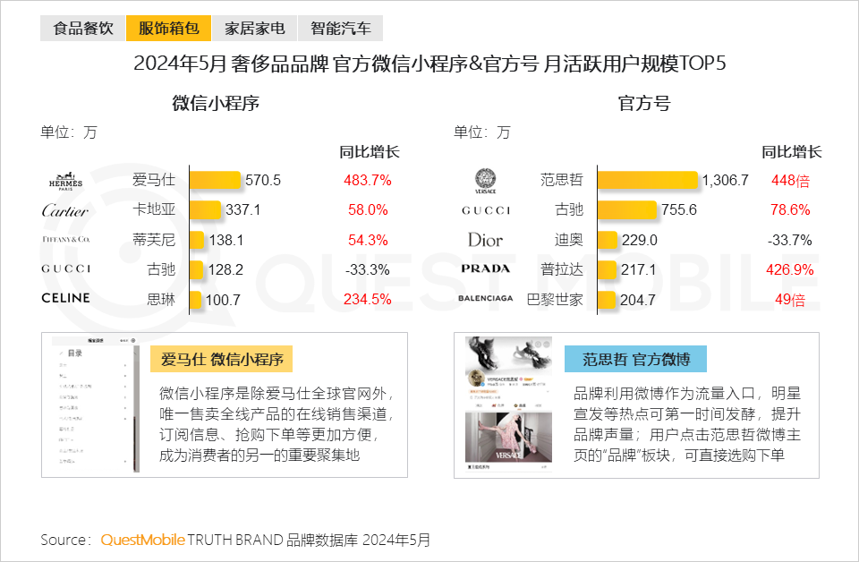 2.3 奢侈品品牌以微信小程序及官方号作为主要私域运营渠道,多个品牌流量大幅增长