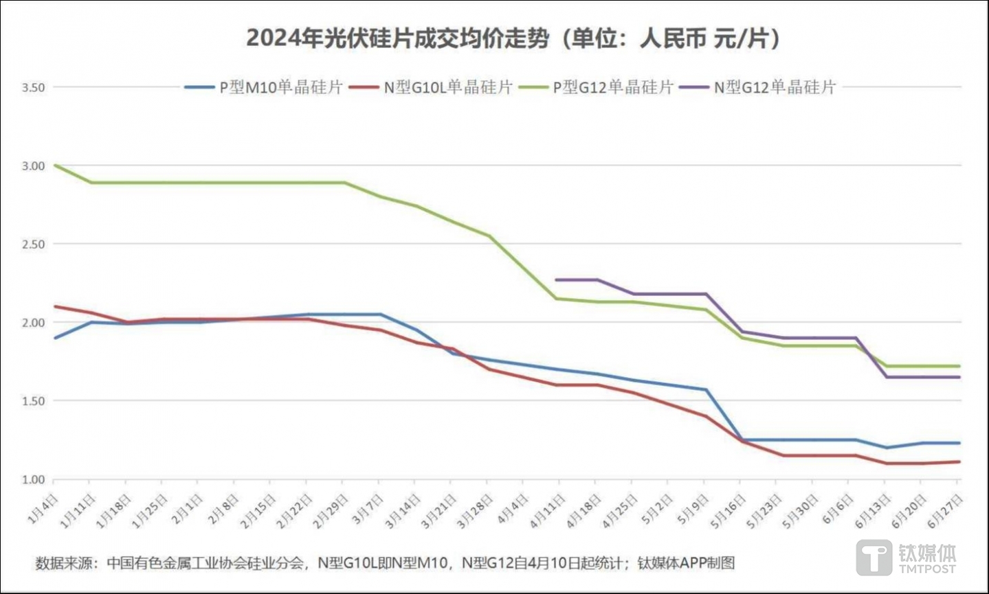 根据硅业分会的统计,P型M10单晶硅片目前成交价格区间为1.2-1.25元/片,成交均价为1.23元/片,较5月底下跌了1.6%,二季度降了30.1%,全年至今下跌35.3%,值得注意的是,该产品月初价格走低后,月中回涨2.5%,近两周则维持稳定;P型G12单晶硅片目前成交价格区间为1.7-1.75元/片,成交均价为1.72元/片;N型G10L单晶硅片成交价格区间为1.08-1.15元/片,成交均价为1.11元/片;N型G12单晶硅片成交价格区间为1.6-1.75元/片,成交均价为1.65元/片,这三类产品单月跌幅均超过3%,其中P型G12硅片先跌后涨,N型硅片则在月初下跌后一直维持稳定,且最高成交价有走高之势。