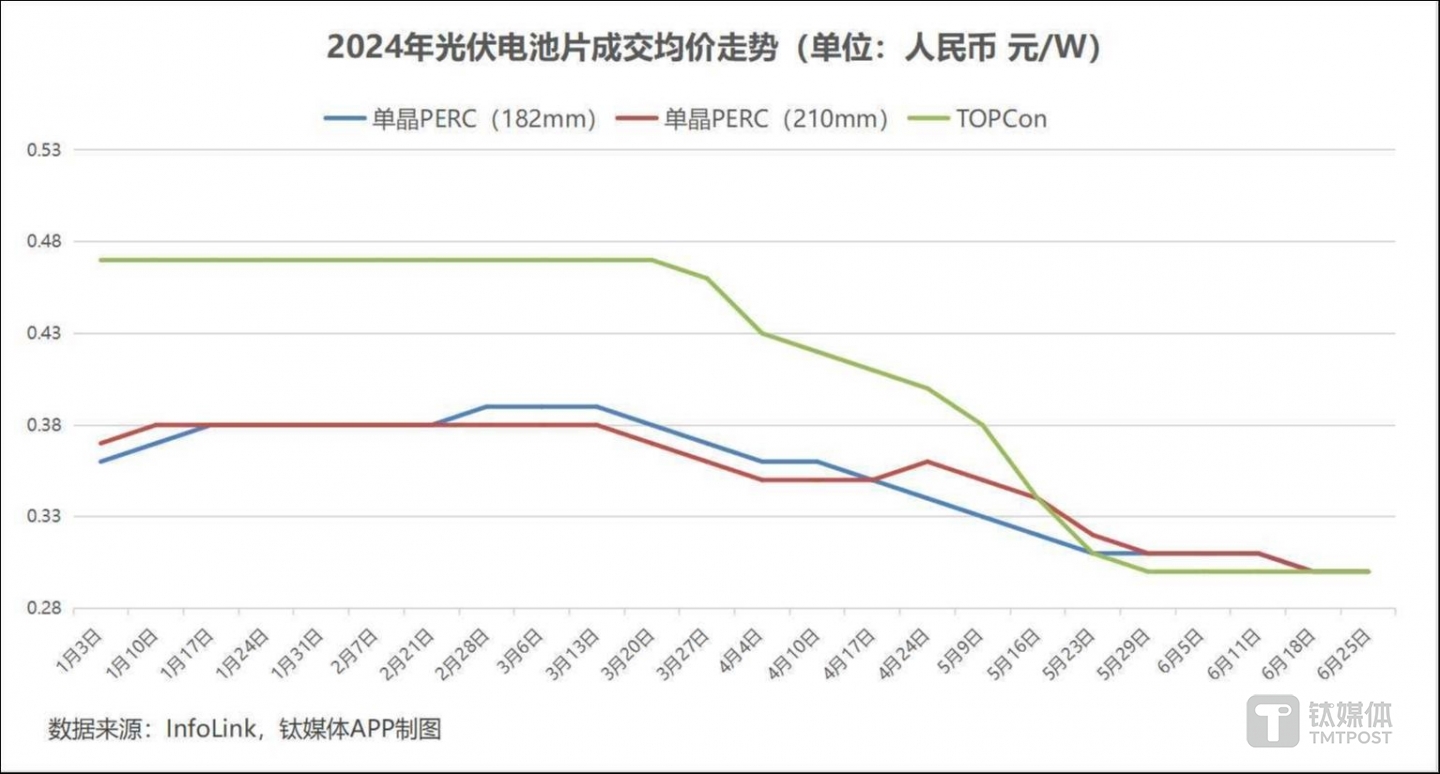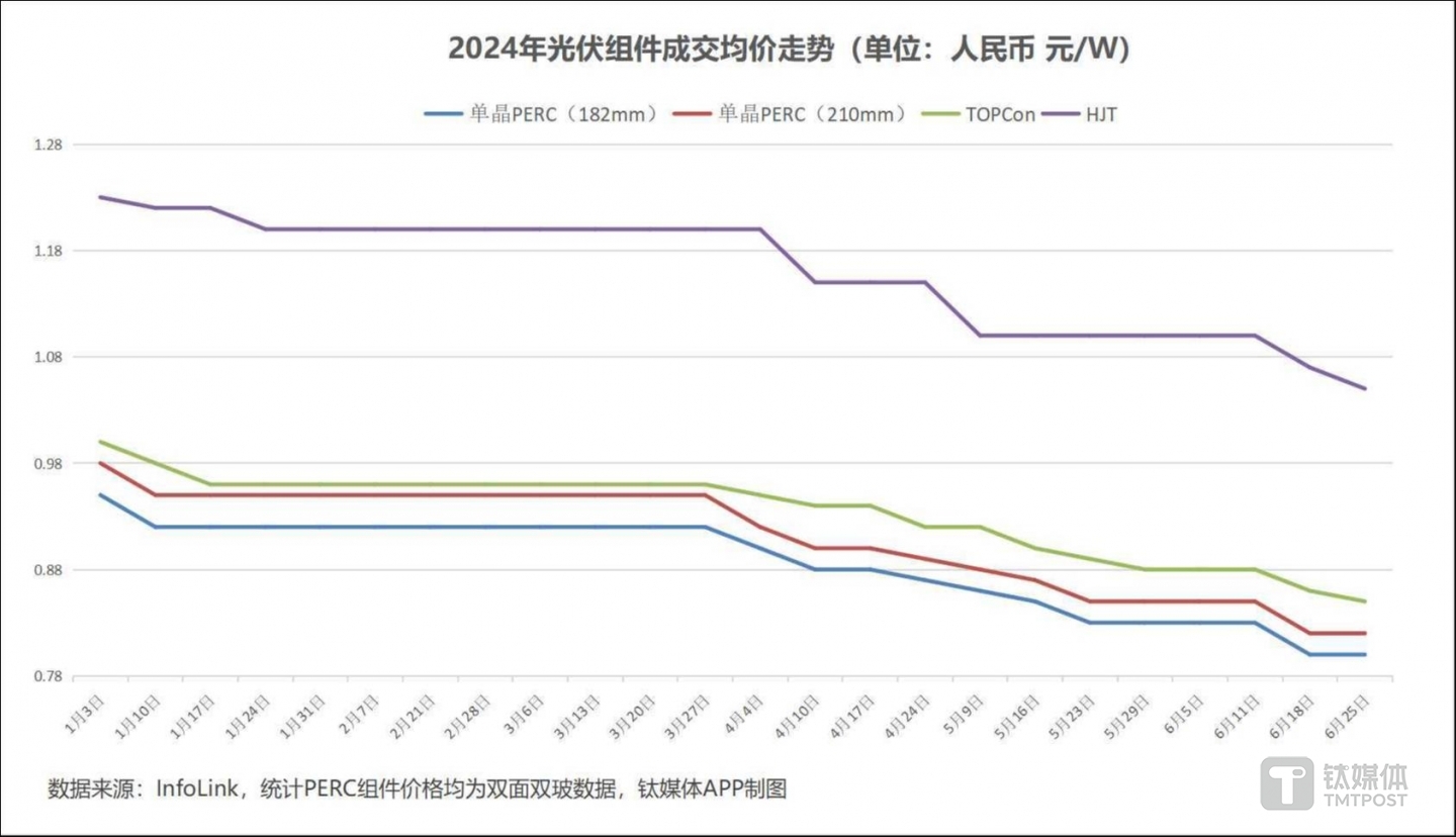 根据InfoLink方面的统计数据,截至6月底,单晶PERC(包括182 mm和210mm)成交价格区间为0.3-0.31元/W,成交均价为0.3元/W,较5月底下跌了3.2%,二季度以来降幅在15%左右,其中182mm单晶PERC全年至今跌去16.7%,210mm单晶PERC全年至今跌去18.9%;N型TOPCon(182*183.75mm)方面,目前成交价格在0.28-0.3元/W之间,成交均价与5月底持平,仍为0.3元/W。不过,在N型放量之际,TOPCon价格则加速下跌,二季度以来跌幅为30.2%,全年跌幅更是高达36.2%,远大于P型,182*183.75mm的TOPCon也与PERC形成平价之势;此外,InfoLink近期新增统计的182*210mm的TOPCon和210mm的TOPCon价格略高,但正处于降价过程中。钛媒体APP也了解到,另一大技术路线HJT电池的价格更高,区间在0.45-0.55元/W左右,走势也相对平稳。