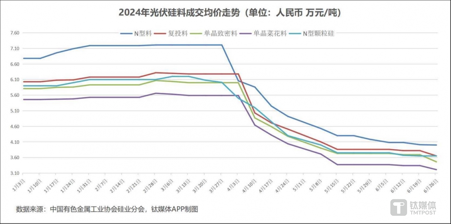 具体数据方面,根据中国有色金属协会硅业分会的统计,截至6月底,复投料成交价格区间为3.6-3.8万元/吨,成交均价为3.65万元/吨,较5月底下降5.4%,二季度以来跌幅达到41.9%,全年至今下跌39.5%;P型致密料成交价格区间一直在3.4-3.9万元/吨之间,但成交均价较5月底降了7.2%,降至3.46万元/吨,二季度以来降了42.3%,全年至今下跌40.5%;P型菜花料跌势趋缓,目前成交价格区间在3.1-3.6万元/吨之间,成交均价为3.21万元/吨,较5月底下降4.8%,二季度以来下跌42.6%,全年至今跌幅为41.2%;N型料方面,N型棒状硅成交价格区间为3.9-4.2万元/吨,成交均价为4万元/吨,较5月底下跌4.3%,整个二季度跌了44.5%,全年至今下跌41%;N型颗粒硅方面,成交价集中在3.6-3.7万元/吨,均价为3.65万元/吨,较5月底降了2.7%,降幅最小,但二季度也跌了39.3%,全年至今跌幅为38.1%。