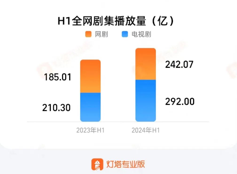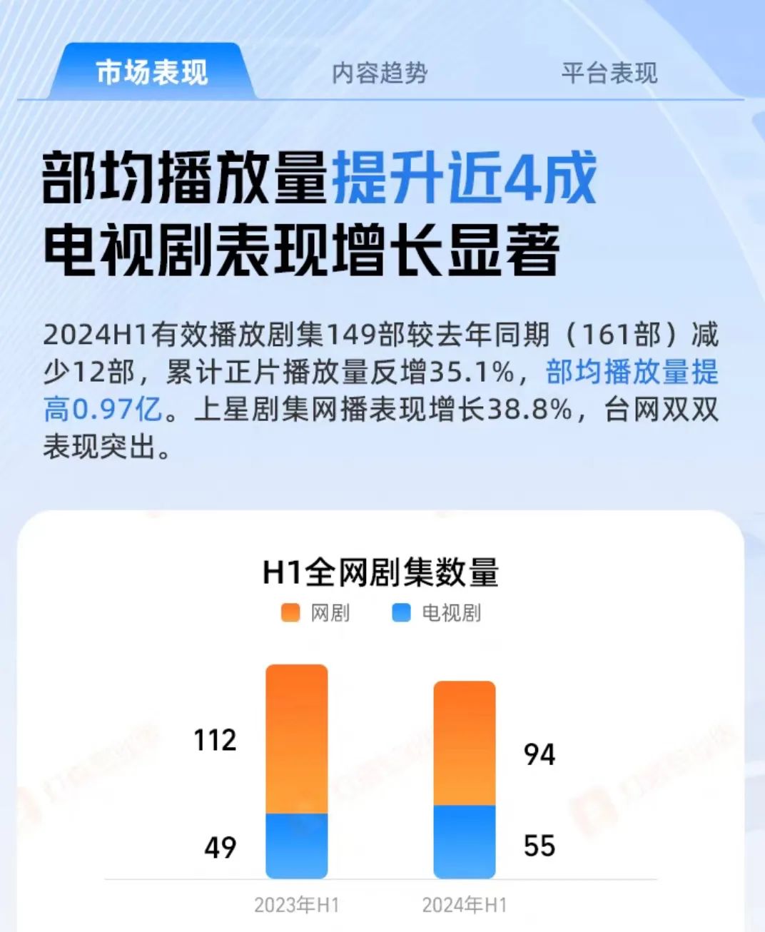 没有席卷观众注意力的“超级大剧”,但头部和腰部项目差距的缩小,反而意味着剧集市场迈入了更稳定的阶段,上半年的数据表现充分验证了“提质减量”已卓有成效:在剧集数量同期减少12部的同时,累计正片播放量反增35.1%,部均播放量也提高了0.97亿。![]()