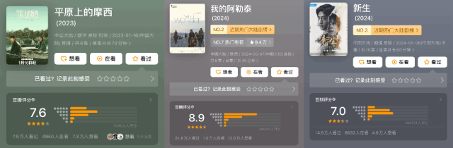 进一步缩短的剧集集数,对创作者而言是一大挑战。在有限的剧集空间内进行创作,需要具备凝练内容和掌控节奏的能力,稍有偏差,就会快速将整部剧的口碑拉下,过短的播出周期,也没有给作品留出弥补口碑劣势的回旋空间。不过,迷你剧的实验性质,也同时吸引了不少具有开创精神的创作者。《平原上的摩西》的导演张大磊、《我的阿勒泰》的导演滕丛丛和《新生》的导演申奥都是电影导演出身,纷纷在迷你剧中进行更大胆的剧作挑战。![]()
