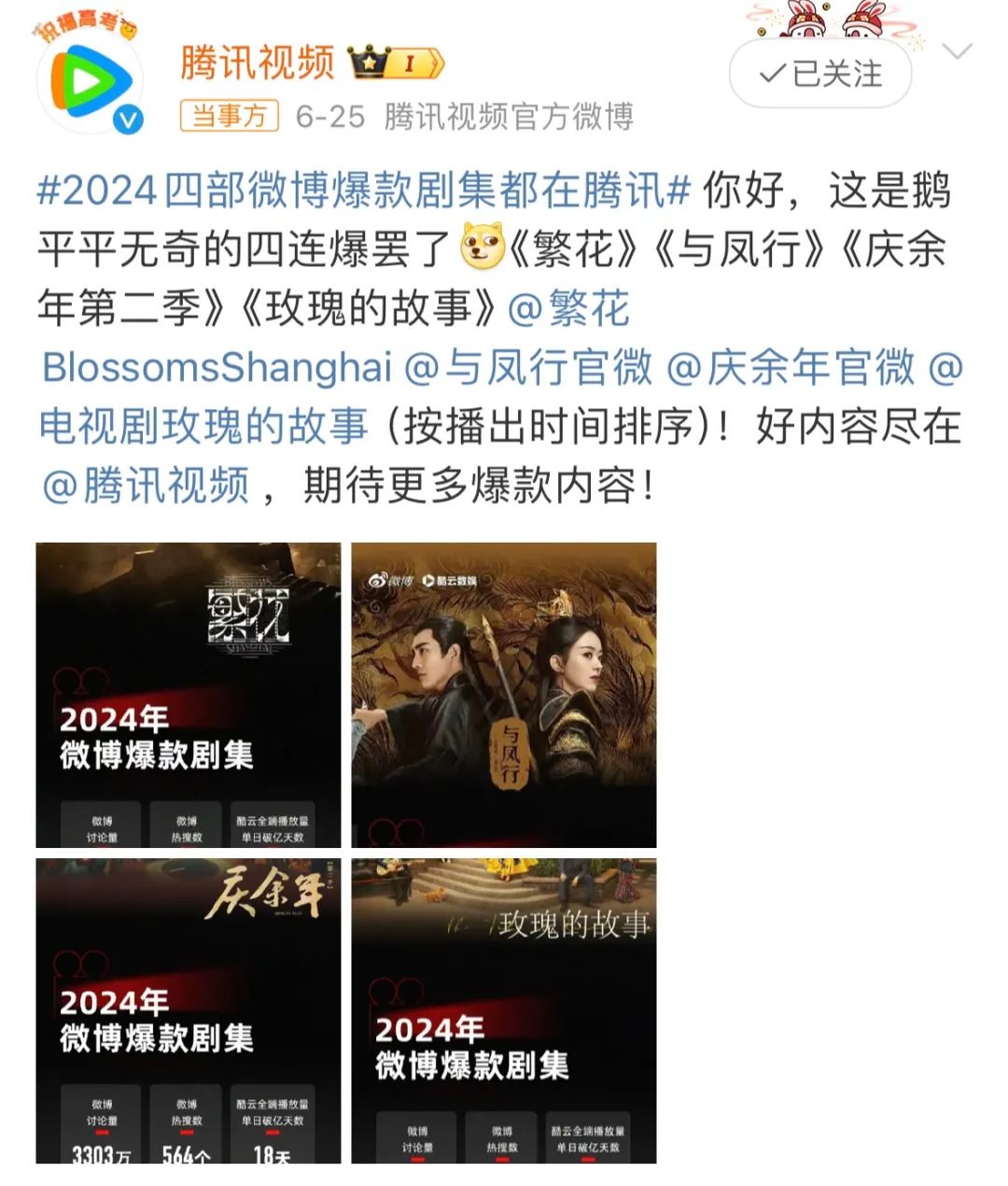 新丽无疑是上半年剧集公司最大的赢家,稳固了其传统六大的头部地位。之前,腾讯视频表示《繁花》《与凤行》《庆余年第二季》《玫瑰的故事》实现了四连爆,而这四部爆款之中,后面三部作品全部由新丽出品。